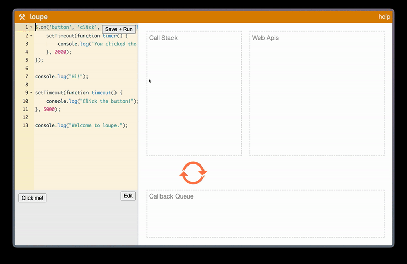 When you run the above tool you can see exactly how the code executes line by line: functions are pushed onto the stack when invoked and removed once the execution completes. When setTimeout() is called, it registers a timer and returns immediately. After the specified delay, the callback (in this case timeout()/timer()) is pushed onto the queue by runtime.